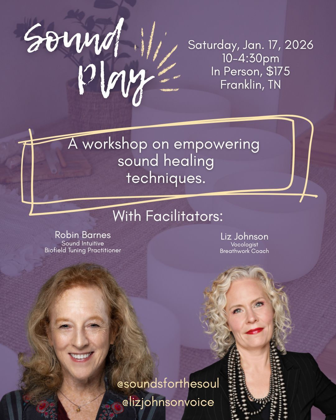 In this immersive workshop Robin & Liz will gently guide you through exploration with sound healing tools including your own voice. By stepping into a deeply restorative experience, you’ll learn to harness the healing power of your own voice and inner rhythm.